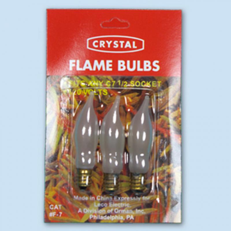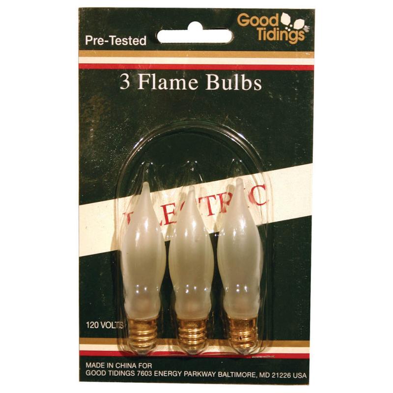 Electric candle replacement bulbs. Three flame bulbs per card. 120 volt.