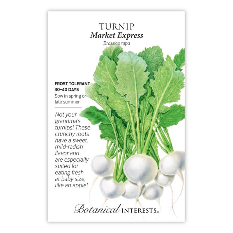 | Join farm-to-table chefs and add this premium Japanese salad turnip to your garden repertoire. Pure white and mild, 'Market Express' is a great baby turnip in salads, crudité trays, and pickling, as well as traditional cooked turnip dishes. The roots have a smooth texture and slightly sweet, fruity flavor that upgrades homegrown meals, and the greens are also delicious. Fast growing, enjoy 2" baby-sized turnips in only 30 days, or grow them to full size (4"–5") in just 40 days. |