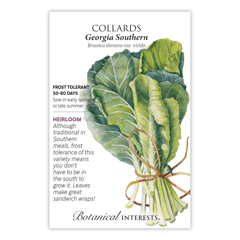 | A staple in the South, collards are a nutritious and versatile vegetable that grows in hot or cold regions with ease. 'Georgia Southern' has been enjoyed since the 1800s. The large leaves not only make delicious steamed greens, they also make fantastic wraps (a low-calorie substitute for tortillas), and when young, hearty salad greens. Fall frosts make them sweeter, and they may overwinter, as they can survive temperatures down to 20°F. Excellent container variety. |