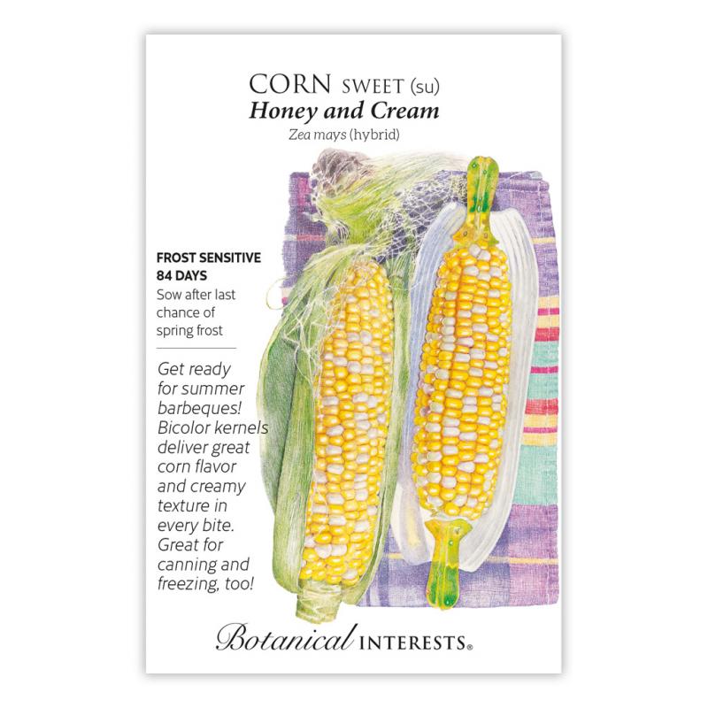 | Corn on the cob is one of the best, and most highly anticipated summer treats. Homegrown corn has amazing flavor and tenderness, so much better than what you find in the grocery stores. A perfect blend of luscious, white, and yellow kernels just bursting with flavor, this corn will be a hit at your next barbeque. Each 7" bicolor ear has about 12 rows of sweet, creamy kernels. 'Honey and Cream' cans and freezes well, too—savor summer all year! Disease resistant. |