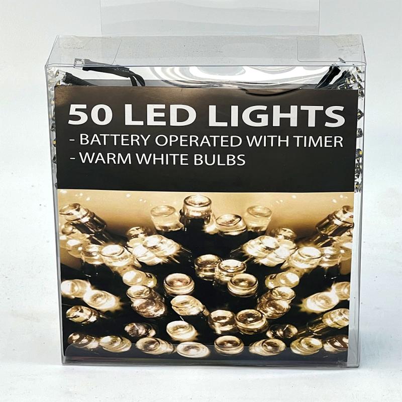 | This battery-operated LED Set has 50 warm white green wire LED mini conical lights. The light length is 16.5 feet, with 10-inch leads and 4-inch bulb spacing. It operates with 2 D batteries and a timer (6 hours on, 18 hours off). This set can be used indoors and outdoors. |