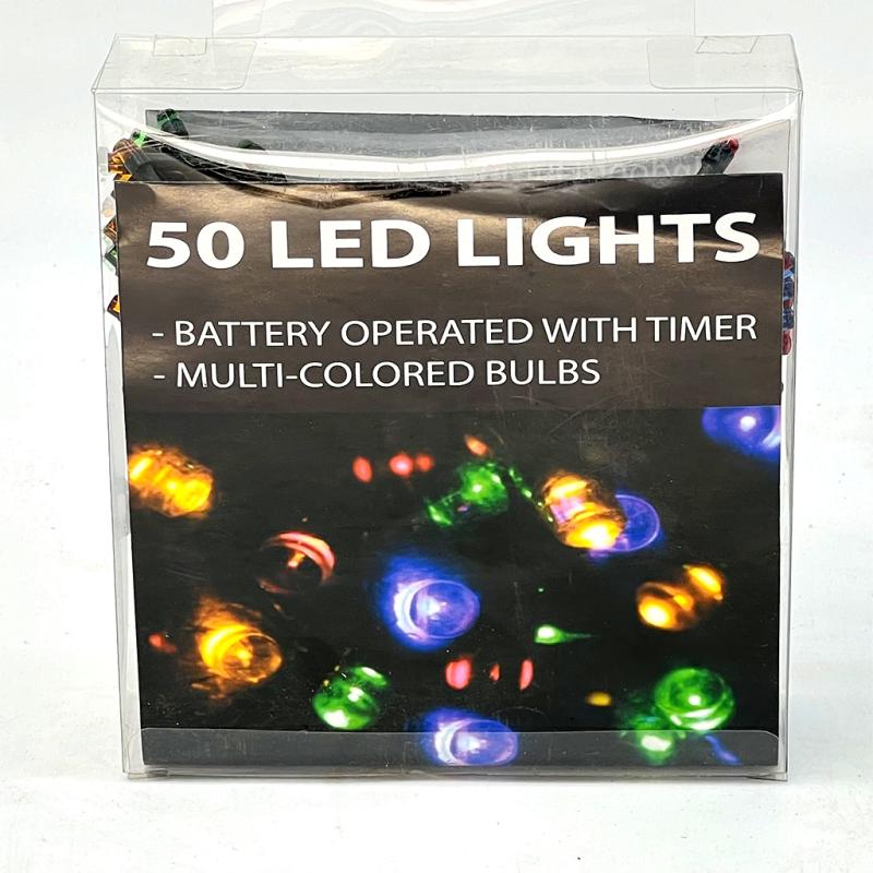 | This battery-operated LED Set has 50 multi-colored green wire LED mini conical lights. The light length is 16.5 feet, with 10-inch leads and 4-inch bulb spacing. It operates with 2 D batteries and a timer (6 hours on, 18 hours off). This set can be used indoors and outdoors. |