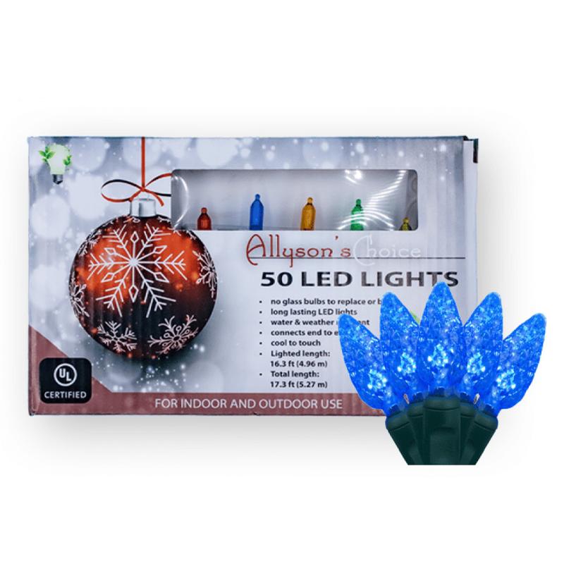 | The Allyson's Choice 50 blue LED C6 faceted green wire light set with UL end connector is 16.5 inches long, with a bulb spacing of 4 inches, a 12-inch lead, and a 4-inch tail. You can connect up to 43 sets together. They are steady burning, cool to the touch, and can be used indoors or outdoors. |