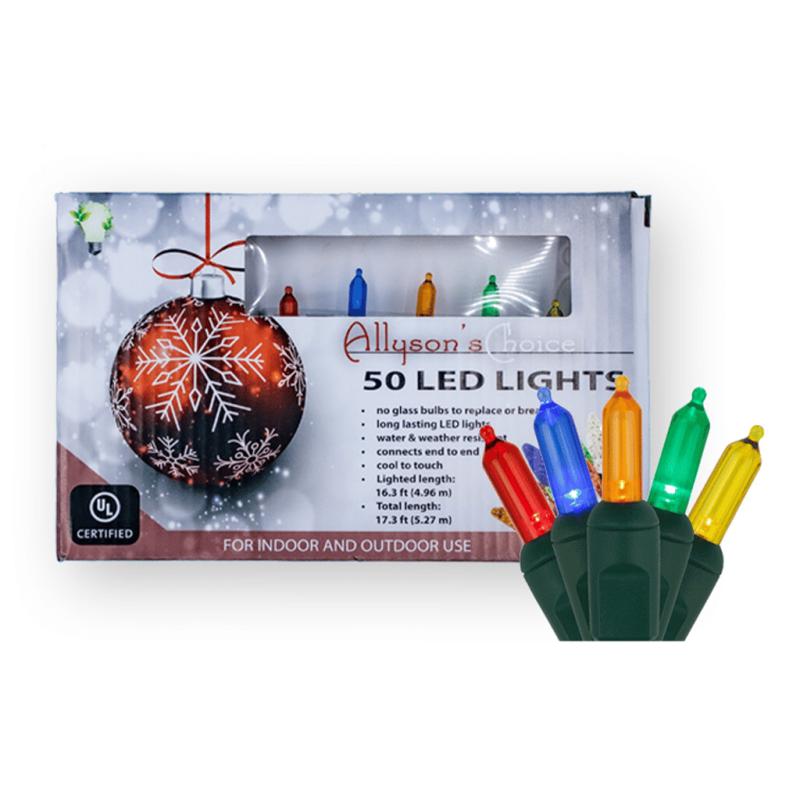 | Allyson's Choice LED M5 Mini Light Set has 50 multi LED mini lights with green wire and a UL end connector. The total light length is 16.5 feet, with 4-inch bulb spacing, a 12-inch lead, and a 4-inch tail. You can connect up to 43 sets of the same kind. These light sets can be used indoors or outdoors. |