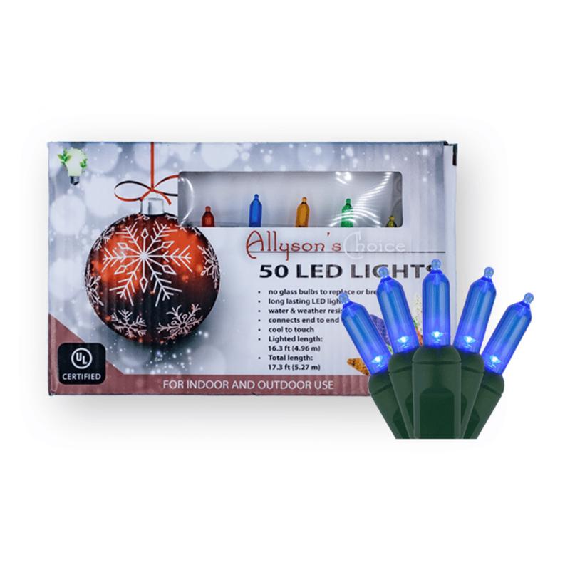 | Allyson's Choice LED M5 Mini Light Set has 50 blue LED mini lights with green wire and a UL end connector. The total light length is 16.5 feet, with 4-inch bulb spacing, a 12-inch lead, and a 4-inch tail. You can connect up to 43 sets of the same kind. These light sets can be used indoors or outdoors. |