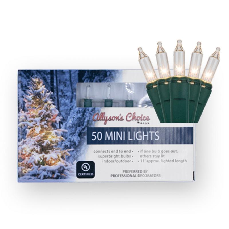 | All Alyson Choice light sets are UL-approved. This set has 50 clear incandescent lights with an 1800-hour bulb life and 2.75-inch spacing. The bulbs are 170 ma and 2.5V, which are considered extra bright. The total Light length is 11.5 feet, and the green cord has an end-to-end connector. The lead length is 12 inches, and the tail length is 2.75 inches. You can put up to 10 sets together for indoor or outdoor use. |