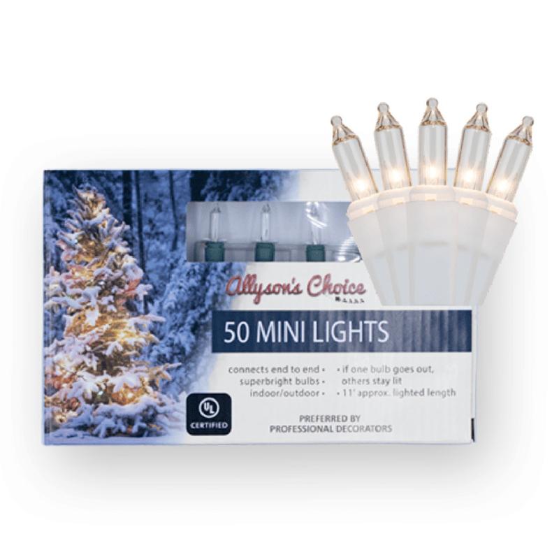 | All Alyson Choice light sets are UL-approved. This set has 50 clear incandescent lights with a 1800-hour bulb life and 2.75-inch spacing with white wire. The bulbs are 170 ma and 2.5V, which are considered extra bright. The total Light length is 11.5 feet, and the white cord has an end-to-end connector. The lead length is 12 inches, and the tail length is 2.75 inches. You can put up to 10 sets together for indoor or outdoor use. |