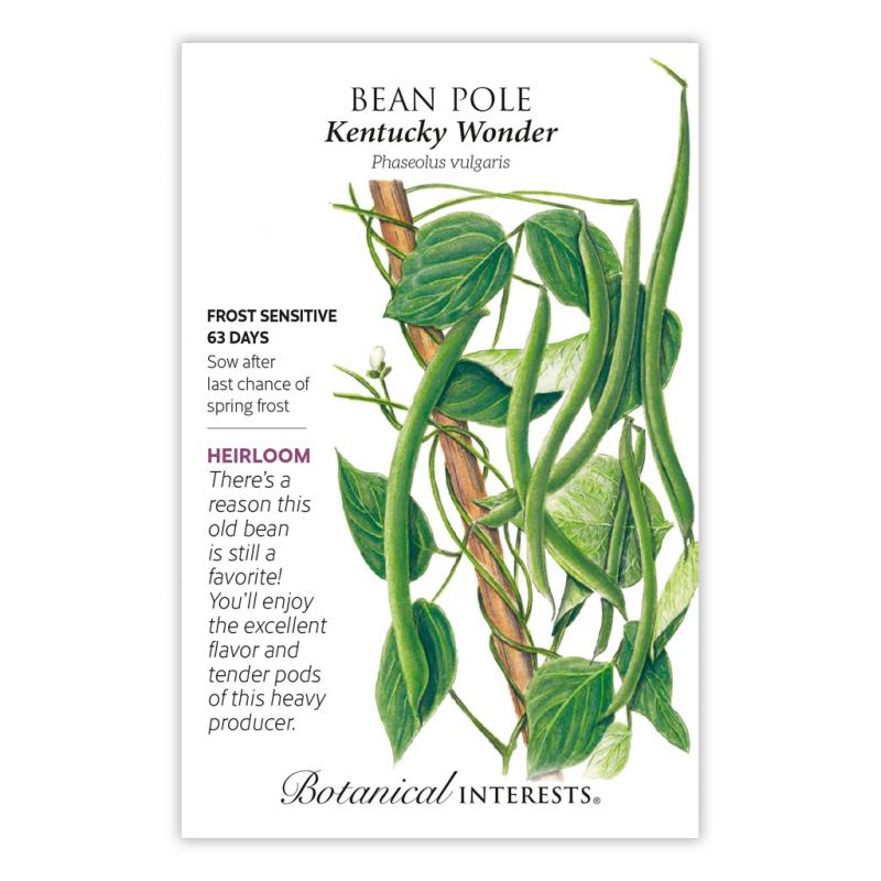 | You can't lose with this 1800s heirloom. 'Kentucky Wonder' (brown seeded) has wonderful, if not unsurpassed flavor. It out-produces most other pole beans with heavy crops of 9" long, gently curved, oval pods. A multi-use bean: drying, shelling and green. Stringless when young. Excellent for freezing. Good production even in hot climates. Disease resistant. |