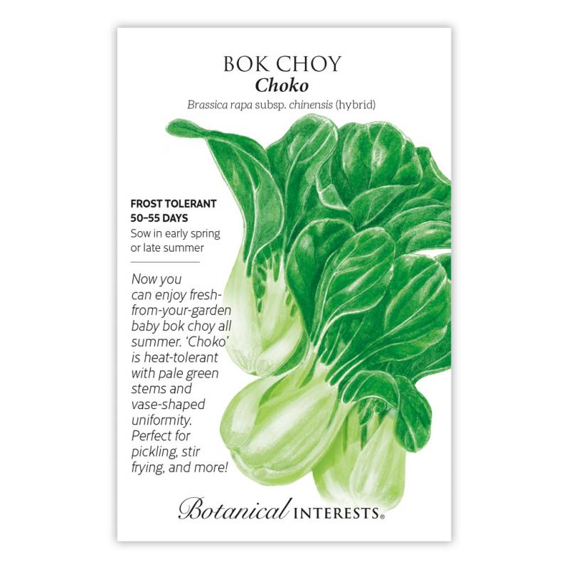| This baby bok choy or pak choi tolerates heat, so you can grow it all summer. Harvest at 4" tall for delicate, crisp, and pleasantly mild-flavored leaves. An indispensible stir-fry ingredient, also try it fresh or marinated for salads, or make baby bok choy kimchi. The uniform, green leaves look beautiful when grown alongside flowers. Great for containers, too! |