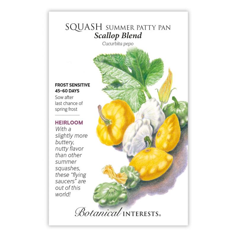| If you love summer squash, you won't be able to get enough of this colorful blend of scallop types that are pretty enough to display in a bowl on your kitchen counter. This blend includes heirlooms 'Early White Bush', 'Bennings Green Tint', and 'Yellow Bush'. Begin to harvest when squash are 2" wide and at their most tender, luscious peak. |