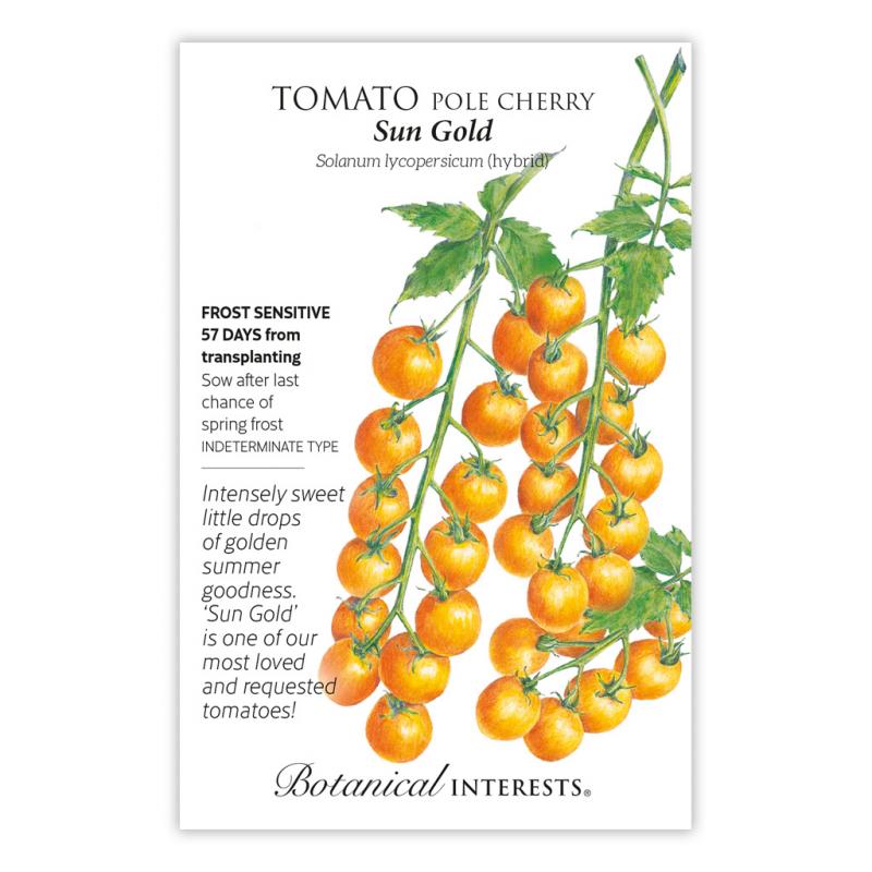 | Rare in grocery stores, 'Sun Gold's' plump, tangerine-colored fruits are a special treat at the peak of flavor in the garden-very sweet and juicy! Provide support for vigorous vines that easily reach 6' long. Pick a bit early and ripen indoors at room temperature. Low-acidity tomato. Disease resistant. |