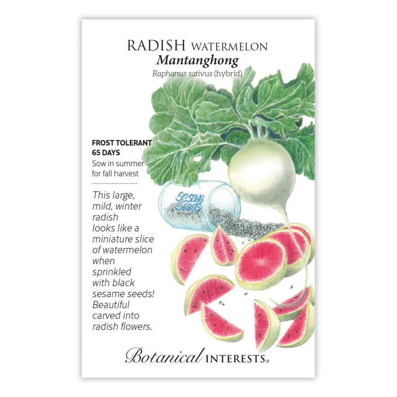| It is no wonder that 'Mantanghong' is the most popular of the Chinese "beauty heart" radishes. This summer/fall-sown radish produces large, 3" round, mild radishes that can weigh up to 1 pound each! Slice the greenish white exterior to reveal a vivid, fuchsia interior. Whether you enjoy radishes raw, cooked, or pickled, these beauties are sure to be a star. Winter radishes are best sown in the late summer or fall, as short days trigger root growth. |