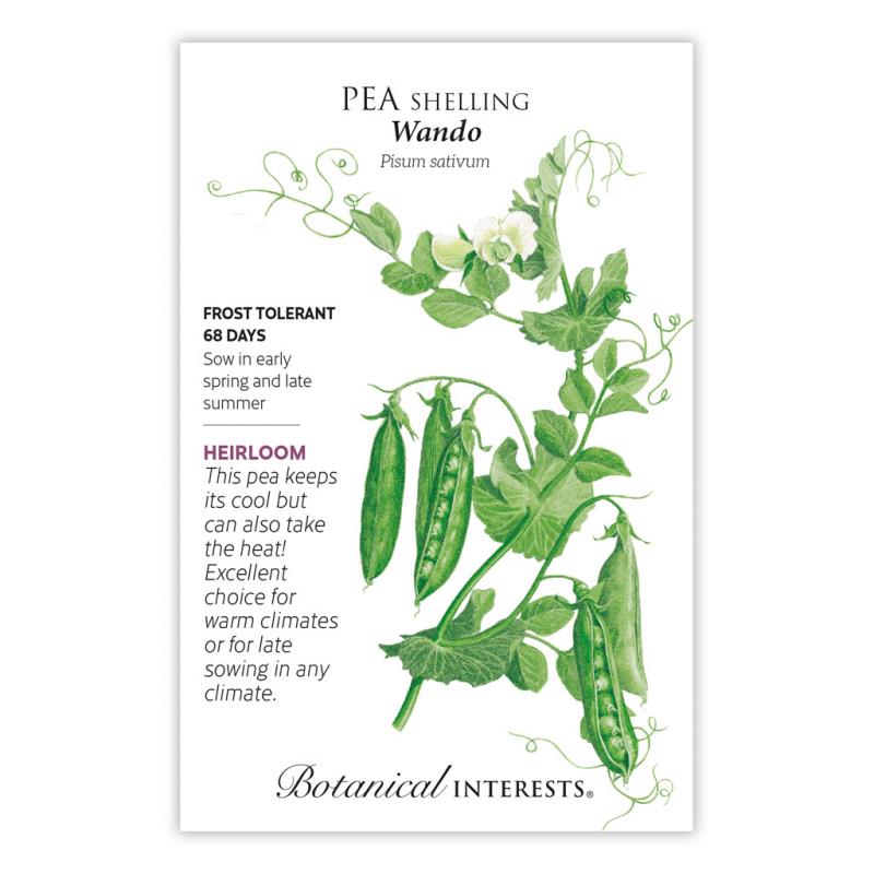 | Introduced in 1943, 'Wando' is a cross between 'Laxton's Progress' (an English heirloom) and 'Perfection' (a New England heirloom). It is cold tolerant for early sowing, and more heat tolerant than other pea cultivars. Sturdy, 24"-30" plants with 7-9 medium-sized peas in each pod. Sow in early spring and again in midsummer. In mild climates, it can even be sown in fall for winter harvest. |