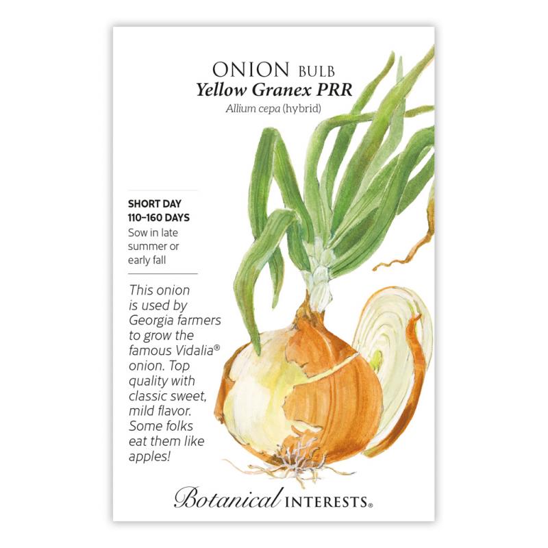| The secret to growing really sweet, mild onions is to start with a sweet, short-day variety and have soil that is very low in sulfur. 'Yellow Granex PRR' (pink root resistant) is one of the few varieties approved by the Georgia Agricultural Commission to be sold as a Vidalia® onion when it is grown in approved areas near Vidalia, GA. Large (3"–4") and excellent for eating fresh. As a short-day onion, it grows best from fall to spring in the southern states, south of the 35th parallel. Not recommended for cold-climate areas unless greenhouse grown. |