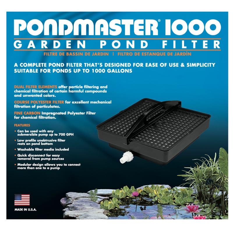 | A garden pond filter for ponds up to 1,000 gallons that can be used in conjunction with any submersible pump up to 1000 gph. Additional units can be added for higher capacities. Its unique handle serves as positive locking mechanism for the filter compartment and provides a convenient means of attaching a rope or pole to position or retrieve the filter in the pond. Also features a quick disconnect fitting which enables it to be easily attached or removed from the pump. Two reusable filtering media: coarse polyester for particle filtration and carbon-impregnated for chemical filtration. |