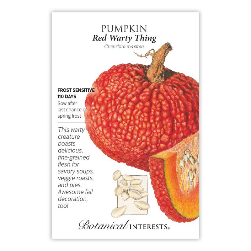 | Developed from the 1897 heirloom 'Victor', which spent years in storage at the U.S. Seed Bank. Peculiar looking, but renowned for delicious flavor and fine texture. The bumpy, thick, red-orange skin protects the 10–20 pound pumpkins, allowing them to store for many months. Whether you carve it or eat it, 'Red Warty Thing' is sure to receive a lot of oohs and ahhs! 1–2 fruits on 10'–15' vines. |