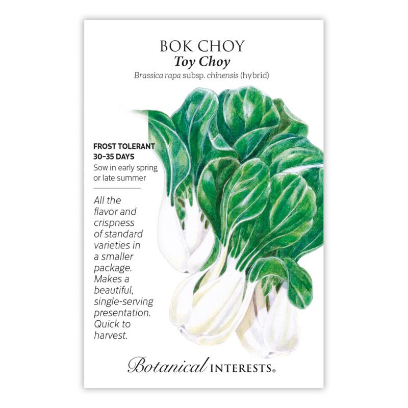 | Bok Choy Toy Choy, also called pak choi, is a leafy green cultivated in Asia for centuries. A miniature variety, 'Toy Choy' grows just 5" tall and is ready to harvest in as few as 30 days. Its thick, white stems and glossy, dark green leaves are tender and crisp. It tolerates warm weather better than full-size types. Small plants are ideal for growing in containers. |