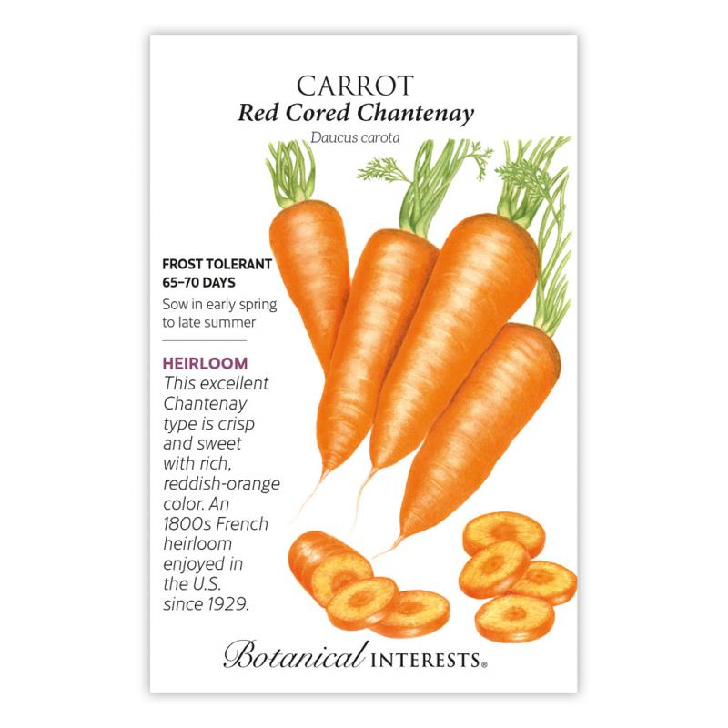 | Red Cored Chantenay' has 6"-long, thick, blunt roots, making it reliable even in heavy or shallow soils. Expect big yields that resist splitting and forking. An excellent variety for juicing, canning, freezing, and cooking in soups and hearty stews. Excellent storage carrot, growing sweeter with time. |