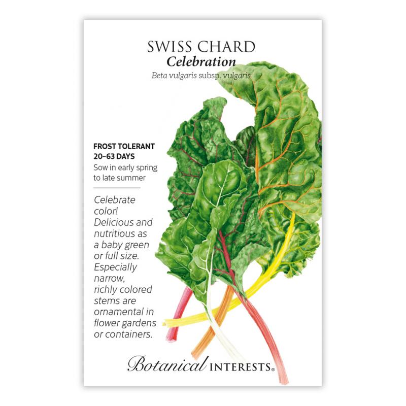 | The bright colors of 'Celebration' are cause for, well, a celebration! Red, magenta, orange, pink, yellow, and white stems support glossy, dark green leaves—a beautiful ornamental for the flower garden or large containers! New selection with deeper colors and less white in the mix, but with flavors as bright as ever. Open-pollinated variety with uniform leaves and stems, a great specialty chard for the home gardener. Harvest all summer or grow for baby greens! |