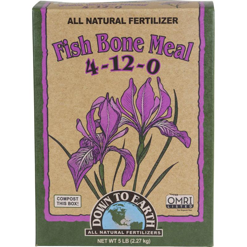 | Down To Earth Fish Bone Meal 4-12-0 Fertilizer is a marine based alternative to traditional steamed Bone Meal and is wonderful for all flowering plants, trees and shrubs. A great source of Phosphorus and Calcium, Fish Bone Meal also contains a small amount of Nitrogen and is an ideal fertilizer for new garden beds, perennials and bulbs. OMRI List and CDFA Listed (Registered Organic Input Material). |