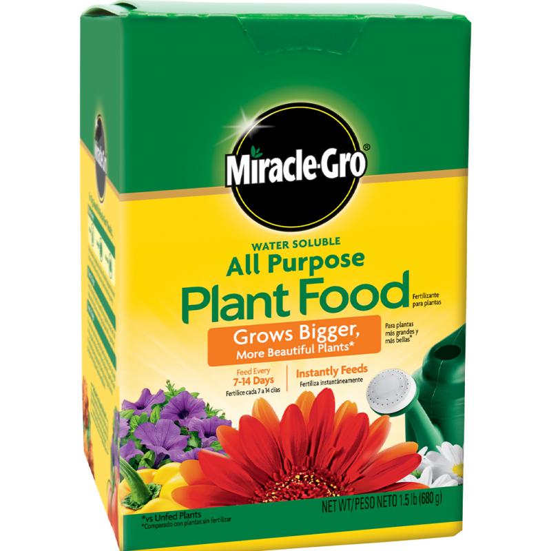 | Water Soluble All Purpose Plant Food 24-8-16 is great for all types of plants, vegetables, trees, shrubs and houseplants. Works instantly for quick, beautiful results. Feeds through leaves and roots. Use in either the Miracle-Gro Garden Feeder or watering cans. Guaranteed not to burn when used as directed. Retailers only. |