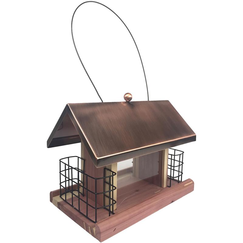| Pennington® Cedar Copper Roof Cafe Bird Feeder is an attractive hopper-style feeder. The copper roof adds a decorative touch to any outdoor space. With two attached suet baskets, it allows for simple feeding of seed and suet from one feeder. Feeding both seed and suet from one feeder will attract a wide variety of colorful songbirds to your outdoor space. Pennington Cedar Copper Roof Cafe holds up to 2.5 pounds of various seed types, such as mixed seed, sunflower seed, and seed blends, and 2 suet cakes, allowing fewer trips to the bird feeder to refill. It comes fully assembled, is easy to fill, and is ready to hang with a weather-resistant hanging cable. |