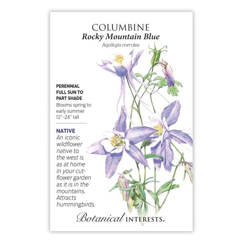 | The state flower of Colorado, Rocky Mountain Blue is a beautiful heirloom addition to your perennial garden. Along with the dazzling pale violet and white, long-lasting blossoms, it has delicate, beautiful, blue-green foliage, somewhat like maidenhair fern. At home in part shade as well as full sun. Use in rock gardens, borders, and as a cut flower. North American native wildflower. |