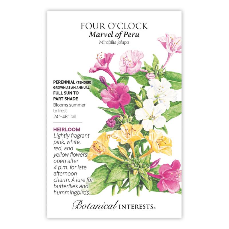 | Named for its characteristic of blooming after 4pm, fast-growing Four O'Clock flourishes almost anywhere including hot, windy spots, and tolerates most soil types. Fragrant, tubular flowers attract hummingbirds and other pollinators. Excellent as an annual hedge. Reseeds freely. Wonderful in barrels, tubs, or other large containers. |