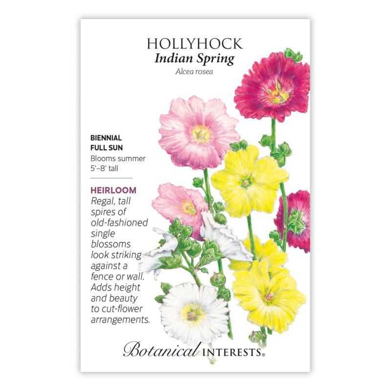 | Transform your garden into a garden of the past! An English garden of the early 1800s would have several varieties of hollyhock. 'Indian Spring' is known to flower in its first season from seed. Even though fairly drought tolerant, it performs best with ample moisture and deep, rich soil for best performance. See instructions inside for making old-fashioned hollyhock dolls. Hollyhock flowers are edible, but very bland; however, the large, colorful petals are lovely garnishing salads or desserts. (The flower's central disk, while edible, can be bitter.) A 1939 All-America Selections winner. |