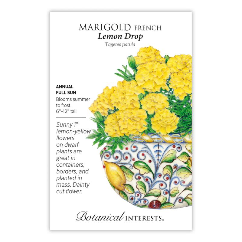 | Every gardener will delight in these adorable, sunny yellow flowers on compact plants. 'Lemon Drop' adds a bright spot of color to the front of the bed, patio containers, and window boxes. In the vegetable garden, it takes up little room, and may reduce soil nematodes. French marigolds are edible, but with a very strong flavor similar to its pungent scent. Practically care-free and will self-sow if a few flowers are allowed to go to seed, providing welcome volunteers next season! |