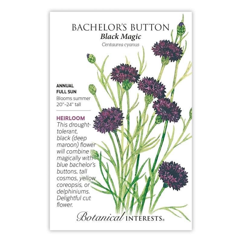 | With vivid color, 'Black Magic' makes great dried or cut flowers, while edible petals make a stunning garnish to salads, crudités platters, or dinner plates. Bachelor's button, also called cornflower, will "naturalize"; it self-sows for another crop of flowers the following season, and birds love the seed heads! |