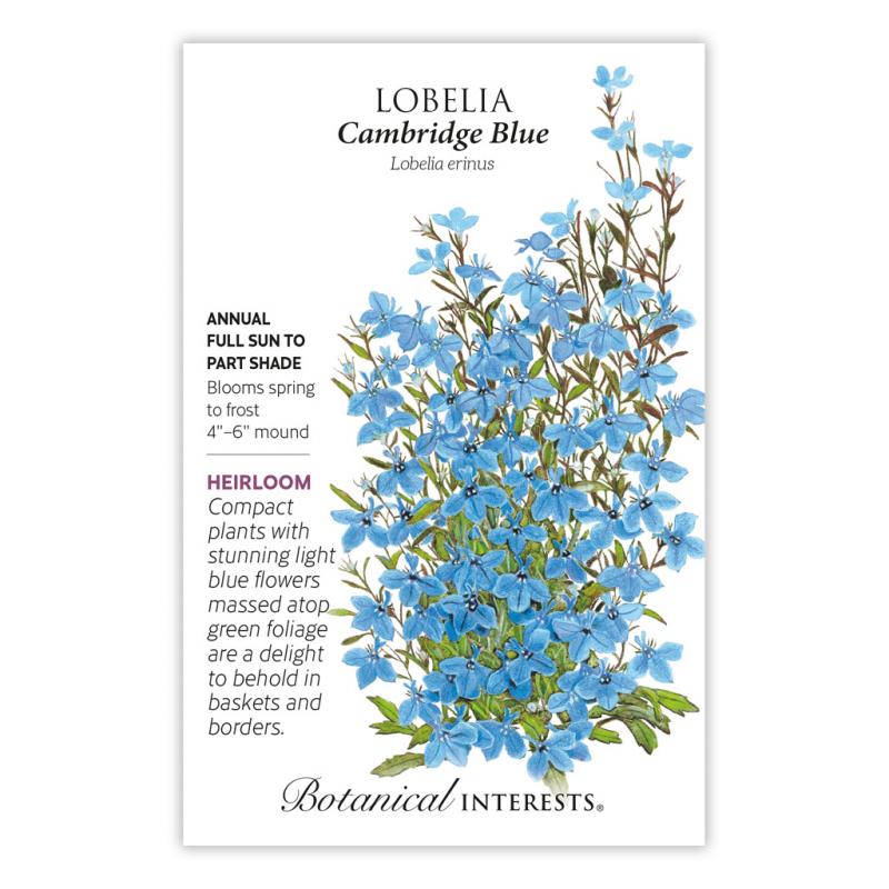 | The soft, light blue flowers of Cambridge Blue are perfect for any spot in the garden, hanging baskets, containers, window boxes, or borders. The pale green foliage is not often seen because of the profusion of flowers that bloom from spring to fall. In mild climates, lobelia will grow and bloom during the winter. Under ideal growing conditions, lobelia may reseed. |