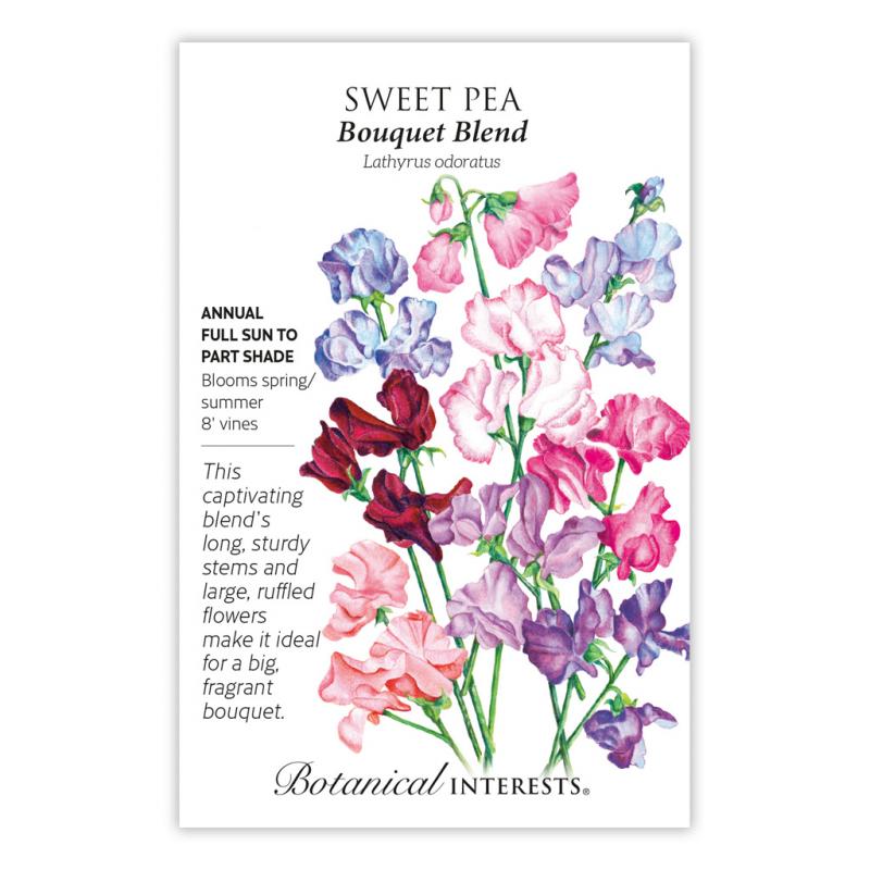 | Bouquet Blend is a colorful, custom mix of Spencer-type sweet peas, ideal for cutting because of their extra-large flowers, longer, sturdier stems, and larger number of blooms per stem. The romantically ruffled, lightly-scented beauties attract pollinators, too! Bouquet Blend flowers in the lengthening daylight of spring. Deer resistant.Caution: Parts of this plant are toxic if ingested. |