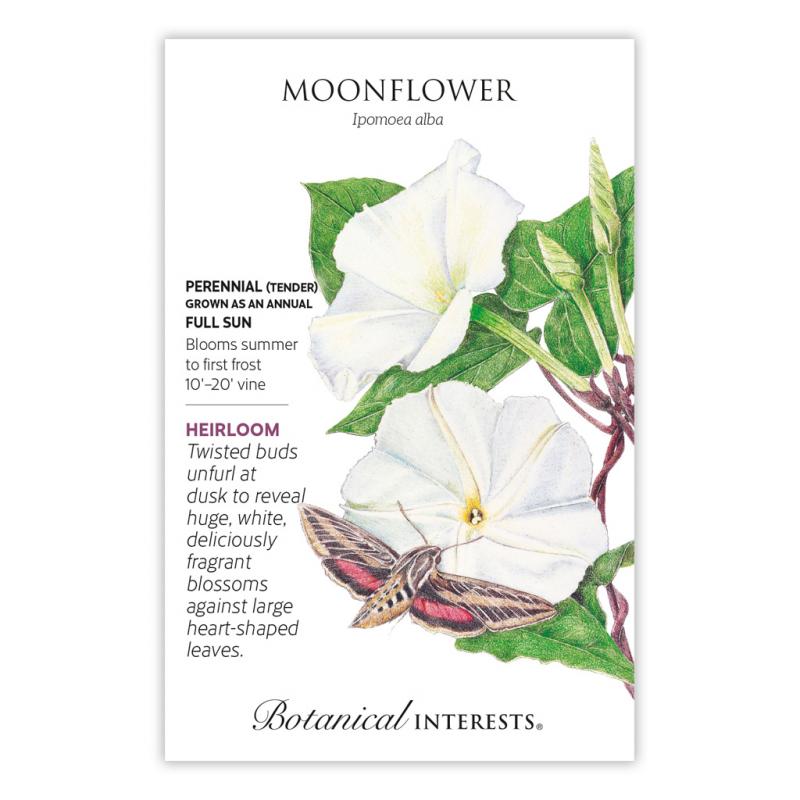 | Enjoy moonflower's evening performance and heady fragrance by training it on a porch column, or a trellis under a window. This Florida native has magnificent flowers that unfold within 2 to 3 minutes, an event worth inviting guests! Caution: All parts of this plant are toxic if ingested. These seeds can not be sold in Arkansas as per state regulations. |