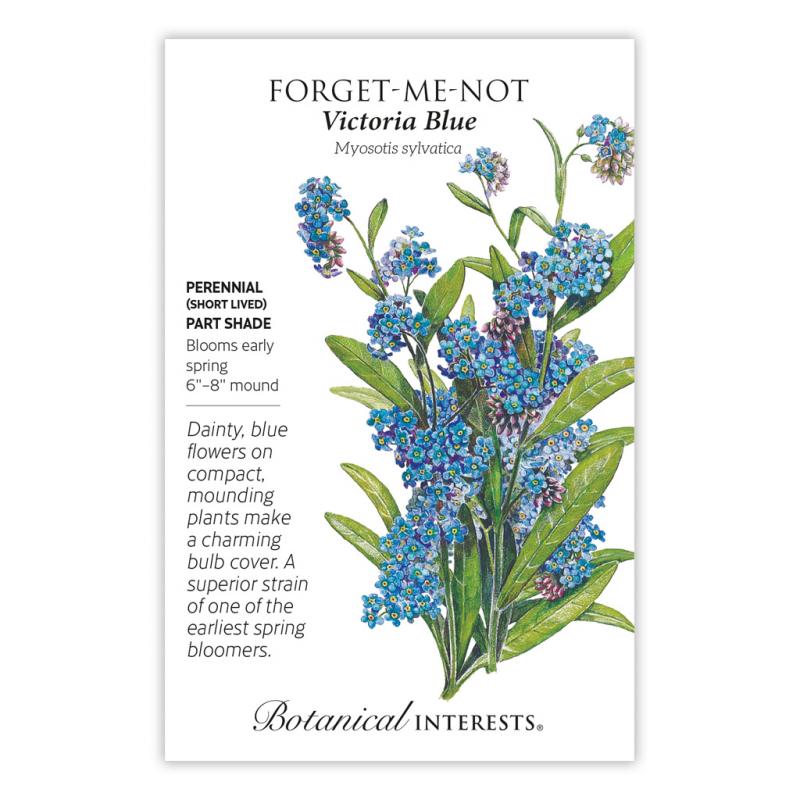 | If you're looking for a shade plant, this is it! A darling, small, compact variety, 'Victoria Blue's' eye-catching, petite, star-shaped flowers are perfect for the front of the garden or as a companion to spring bulbs. A herald of spring, the forget-me-not is also symbolic of friendship and remembrance. This variety seed can't be sold in Wisconsin as per state regulations. |
