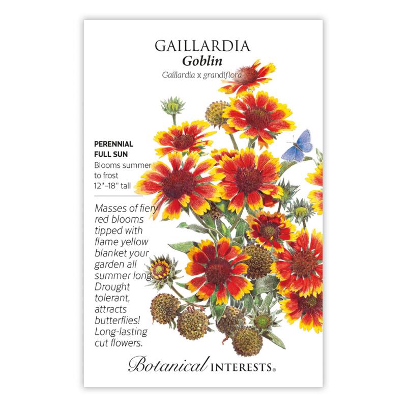| Goblin' is a first-year flowering perennial and compact-growing selection created by crossing native gaillardias. Butterflies love the bright red and yellow bicolored flowers that are continually produced from summer through frost. After the petals fall, the round, reddish-brown seed heads mix among the flowers for added interest and for bird forage. Plants look great even in the heat of summer when many other plants seem to fade. Long-lasting flowers are ideal for fresh bouquets. Also called blanket flower. |