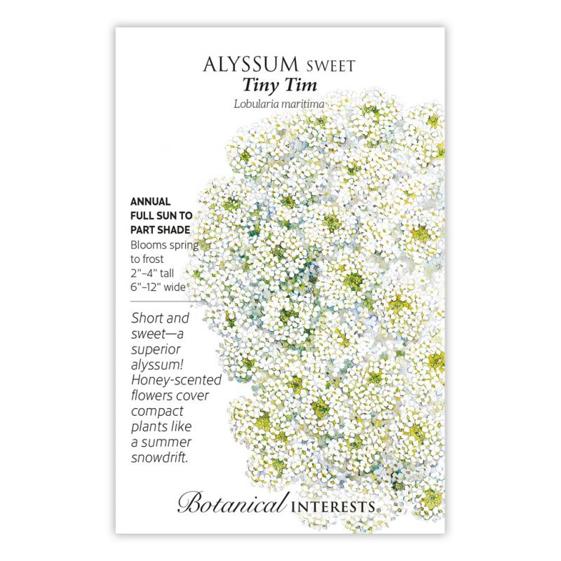 | Nothing adds more delight to summer days than the gentle fragrance of sweet alyssum. 'Tiny Tim' is compact and always covered with flowers. A wonderful ground cover, it blooms all growing season with no need to shear back at any time. Alyssum withstands drought and heat, while attracting pollinators. It is an ideal rock garden plant, and gracefully spills over edges of containers. Edible flowers have a mild, grassy/mustardy flavor; the clusters make a charming garnish to salads and desserts. |
