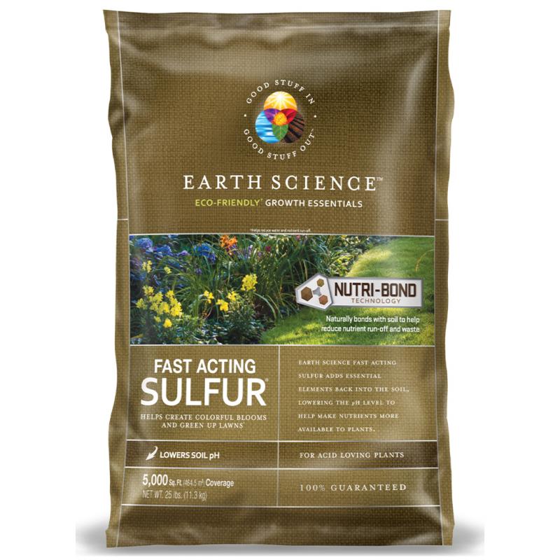 | Earth Science Fast Acting Sulfur adds essential elements back into the soil. It starts working immediately to lower the pH level of your soil to help make nutrients more available to plants, and improve fertilizer effectiveness. Helps create colorful blooms and a lush green lawn. Good for acid loving plants. Contains Earth Science's patented Nutri-Bond Technology, which naturally bonds with soil to help reduce nutrient run-off and waste. It is the result of years of research into methods of reducing fertilizer run-off and waste. Nutri-Bond naturally bonds with the soil to help keep more product where you put it. That's better for the environment and helps your lawn get the most out of every application. GOOD STUFF IN-GOOD STUFF OUT. |