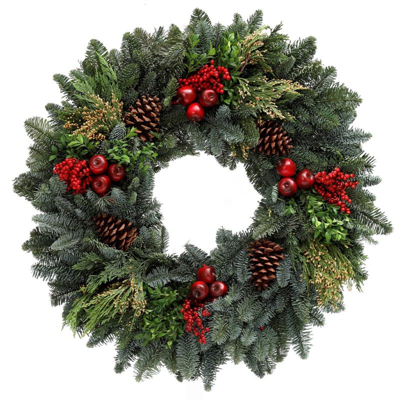 Description: The Royal Fruit Wreath is made with Noble Fir, Green Boxwood, Fragrant Incense Cedar, Ponderosa Pine Cones, faux canella berries, and faux red apples.