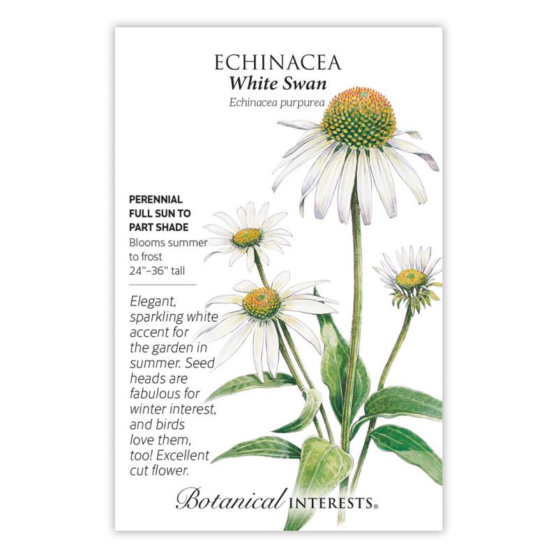 | White Swan' is the perfect name for this graceful echinacea, a natural selection from white-flowered variations of the native, purple echinacea. Its flowers attract butterflies and other pollinators, while birds enjoy the seeds. The cone-like seed heads also add a nice architectural touch to the winter garden. A long-lasting cut flower, it adds a sparkle of white to floral arrangements. |