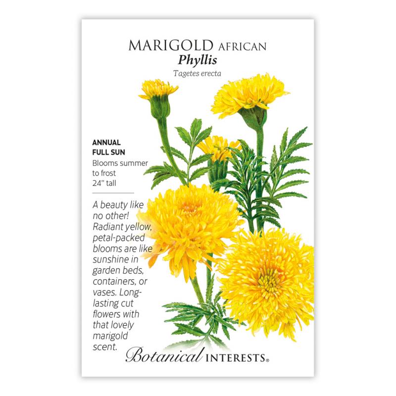 | This flower has a special meaning for me (Judy, co-owner of Botanical Interests). When I was little, I would go with my mom to John's Garden Center in San Jose, CA every spring to purchase very tall, bright yellow marigolds to encircle the patio. She just loved those big, bright, yellow blossoms. It was a very special flower of my youth, so I named this variety after her. For me, Phyllis marigold will remind me of trips to the garden center, spring planting with mom, and her wonderful summer patio parties. Phyllis is also known as 'Mum Yellow' for its chrysanthemum-like 3" flower made up of hundreds of thin, bright yellow petals. Long stems are great for cut-flower bouquets and arrangements. African Marigold petals are edible with a slightly bitter, citrusy/spice flavor. They make a pretty garnish on rice, salads, or desserts. Fairly drought tolerant. |