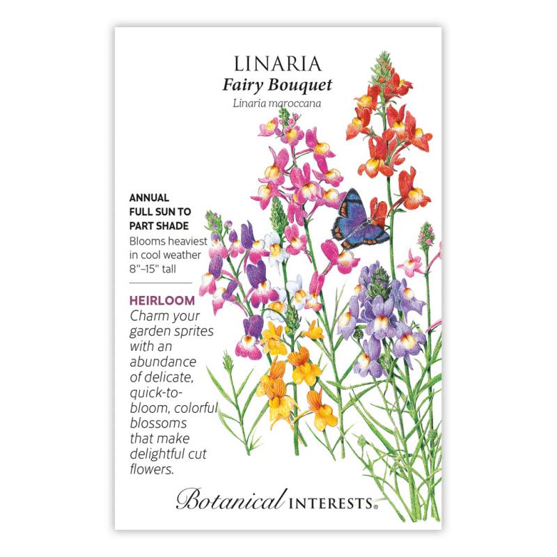 | Fairy Bouquet is a charming blend of bright colored, dainty, 3/4" flowers above delicate, airy foliage. Linaria makes an impressive, colorful show when planted in mass, and is also an excellent container filler or border flower that attracts pollinators. Also known as toadflax, and often called a mini-snapdragon because of the resemblance. Cut flowers make darling bouquets. A 1934 All-America Selections winner. |