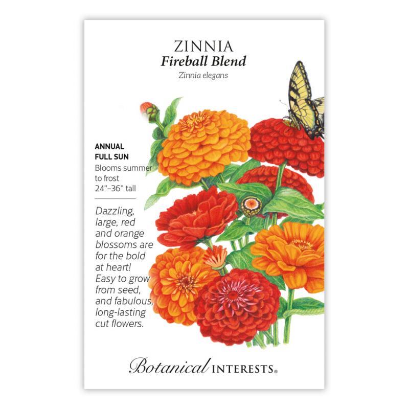 | An eye-engaging combination, these 4"–5" bright beauties have amazing, intense color. The heat-loving, tall plants are great for the back of the flowerbed, and are a sight to behold when planted in mass. Blooms last a very long time on the plant, and in the vase when cut for gorgeous arrangements. Zinnias are edible, but have little flavor. The colorful flowers can make a pretty garnish to salads, desserts, cold drinks, or serving trays. (The flower's central disk, while edible, can be bitter.) |