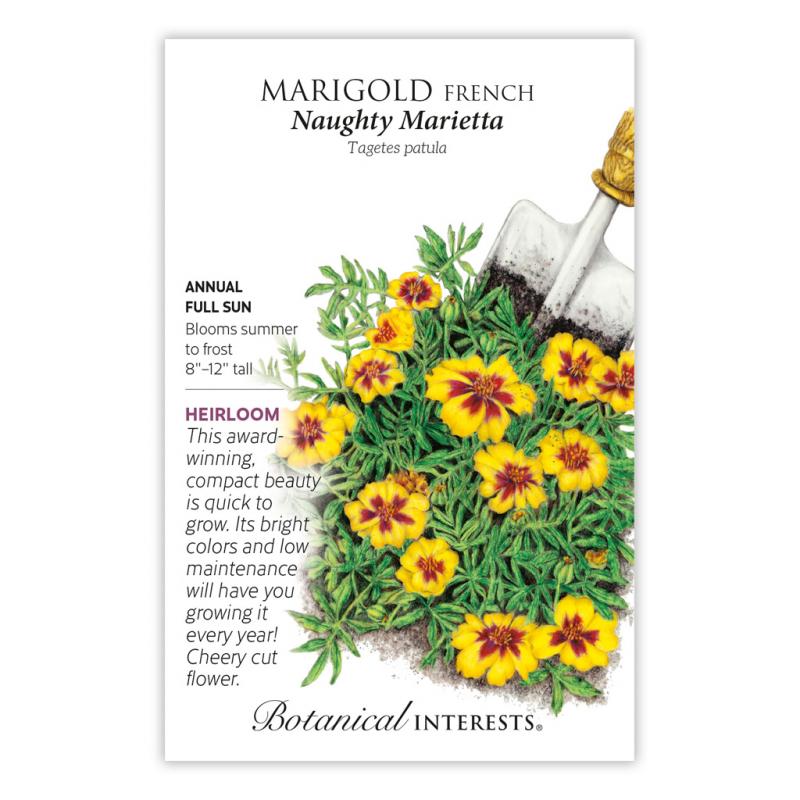 | These gorgeous yellow and maroon flowers are as beautiful as the starlet depicted on the poster of the 1935 movie, Naughty Marietta. This tough garden standard is very easy to grow from seed and blooms profusely and continuously from summer to frost. Fairly drought tolerant, great for containers, attracts butterflies, and may repel soil nematodes.French marigolds are edible, but with a very strong flavor similar to its pungent scent. A 1947 All-America Selections winner. |