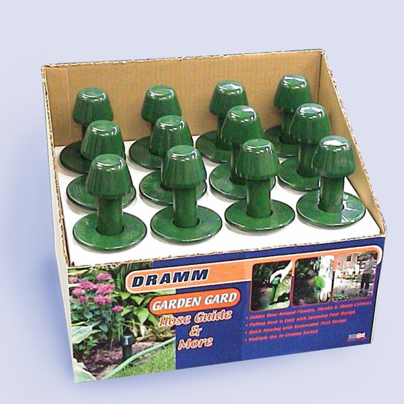 | These 2-piece hose guides are designed to be placed around your flower garden or grass area and keep your hose from ruining your treasured plants. The removable spinning post design allows for quick lawn mowing. The removable 8 inch post rotates as you pull hose across it, for easy maneuvering. Made in the USA. of durable, corrosion resistant plastic. |