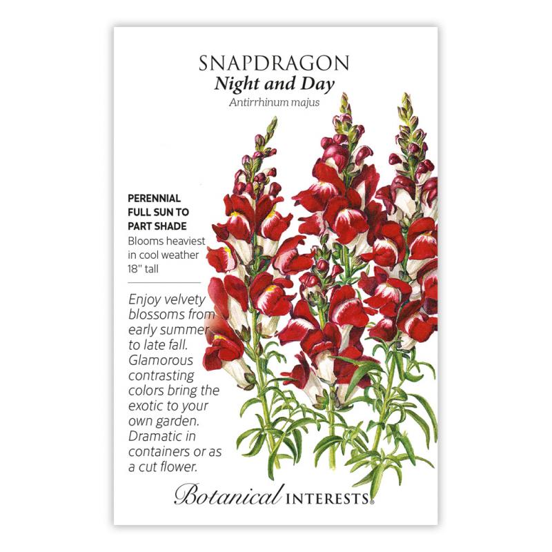 | 'Night and Day' is a spicy scented, visually striking cousin of the 'Black Prince' snapdragon. This bumblebee favorite is long blooming and makes absolutely gorgeous cut flowers! We love how it looks next to bunny tails grass in a container. When the weather cools in fall, its dark red petals turn nearly black and its foliage turns dark burgundy, enhancing the contrast with its lower white jaws. The edible flowers with their unique shape make an interesting and pretty garnish on salads, desserts, and cold drinks. |
