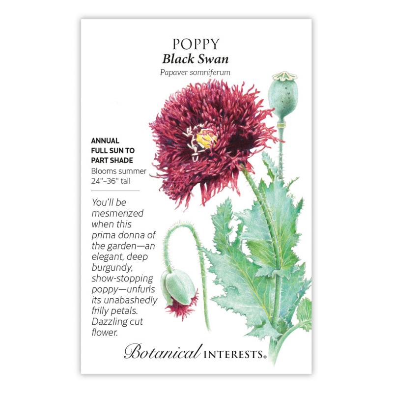 | Black Swan' is too gorgeous to tuck away into a collage of other flowers, with its intricate, finely cut petals as dark as cabernet. Sow it along a path you frequent or in a large container where you can admire its richly colored 3"–5" semi-double blossoms on graceful, curved, swan-like necks, while bees savor the nectar. Harvest them for exquisite bouquets. |