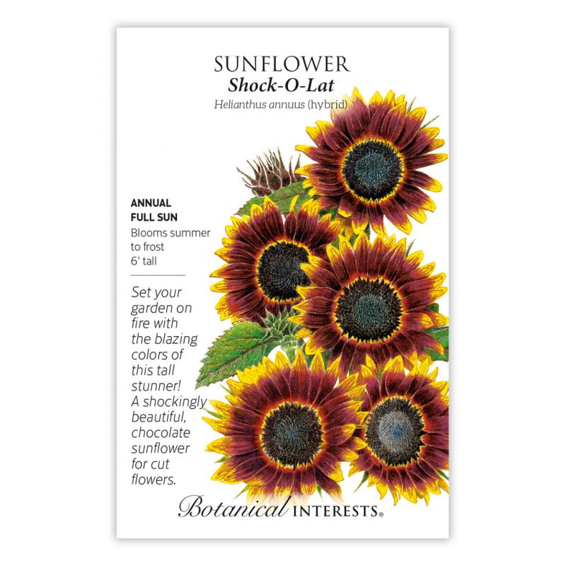 | With yellow-tipped, bronze-red petals, 'Shock-O-Lat' is sure to draw attention. Contrasting purple-tinged stems are well-branched, offering a multitude of pollenless blooms for bouquets. Sunflowers are edible, with a bittersweet flavor. The petals add a pretty pop of color ion salads and desserts. The young, sunflower buds are edible, with a flavor similar to artichoke hearts. They can be grilled, marinated, or sauteed for an unusual appetizer or side dish. The 6" flowers can be tamed down to 3" by spacing plants closely (10" apart). |