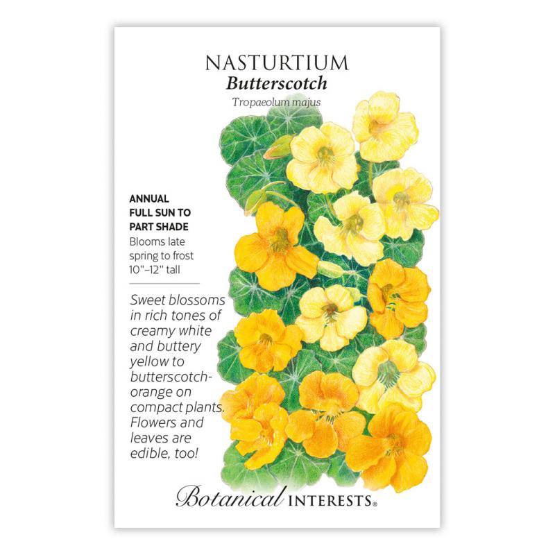 | Warm butterscotch colors in the widely adored nasturtium are not only a treat for the eyes, but for the palate, too! Use the peppery flowers as a beautiful salad or dessert garnish. Short plants are ideal for containers or the front of the garden or border. Usually grown as an annual; perennial in USDA zones 10 and warmer. Fairly drought tolerant once established. Attracts pollinators. Rabbit and deer resistant. |