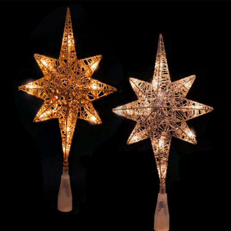 This11 inch Bethlehem star is a metal tree topper with 11 UL lights. That comes in silver glittered or gold glittered.